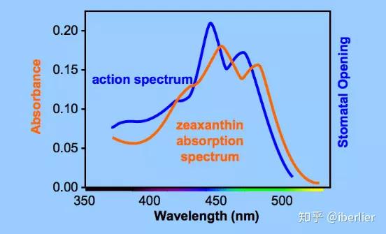高等植物典型的藍光反應(yīng)包括:向光反應(yīng)、抑制莖伸長、促進花色素苷積累、促進氣孔開放以及調(diào)節(jié)基因表達。藍光反應(yīng)的光譜特征為在400nm---500nm區(qū)域內(nèi)呈“三指”狀態(tài),這是區(qū)別藍光反應(yīng)與其他光反應(yīng)的標準。目前對藍光受體了解還不多,有一種色素(隱花色素)主要吸收450---480nm波長。