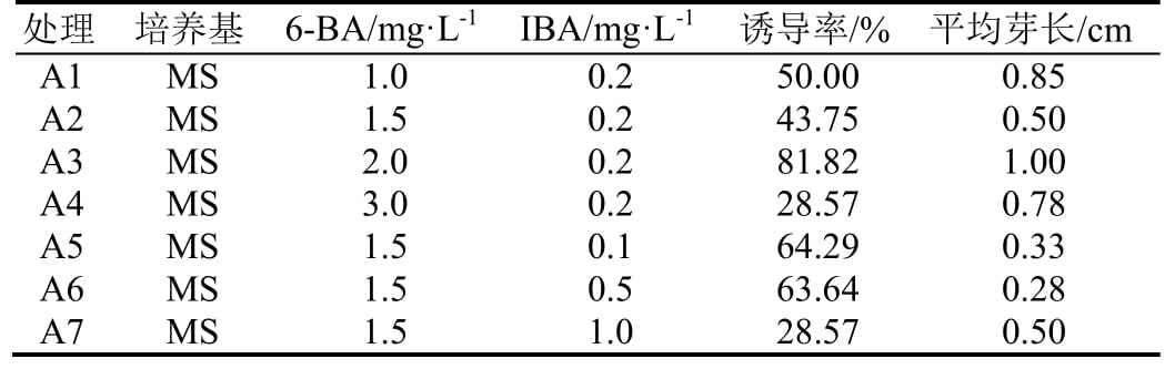 1.2.3 生長(zhǎng)調(diào)節(jié)劑配比試驗(yàn) 將消毒外植體接種到按單因素多水平設(shè)計(jì)的不同生長(zhǎng)調(diào)節(jié)劑配比的、添加0.5 g·L-1活性炭的MS培養(yǎng)基中,共計(jì)7組,分別為:IBA為0.2 mg·L-1,6-BA分別為1.0、1.5、2.0、3.0 mg·L-1;6-BA 為 1.5 mg·L-1,IBA 分別為 0.1、0.2、0.5、1.0 mg·L-1 (表 1)。每組 15 瓶,每瓶接 1個(gè)外植體,每3 d觀察1次,15 d統(tǒng)計(jì)誘導(dǎo)情況。