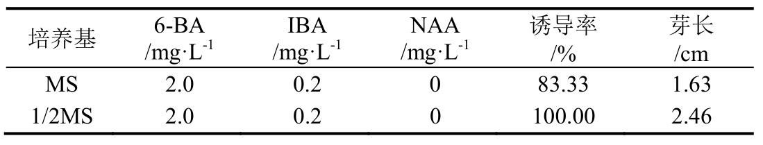 1.2.4 誘導(dǎo)培養(yǎng)基 得出芽誘導(dǎo)佳生長(zhǎng)調(diào)節(jié)劑配方后,對(duì)比添加0.5 g·L-1活性炭的MS和1/2MS培養(yǎng)基的誘導(dǎo)效果,共2組,每組24瓶,每瓶接1個(gè)外植體,每4 d觀察1次,20 d后統(tǒng)計(jì)誘導(dǎo)情況。