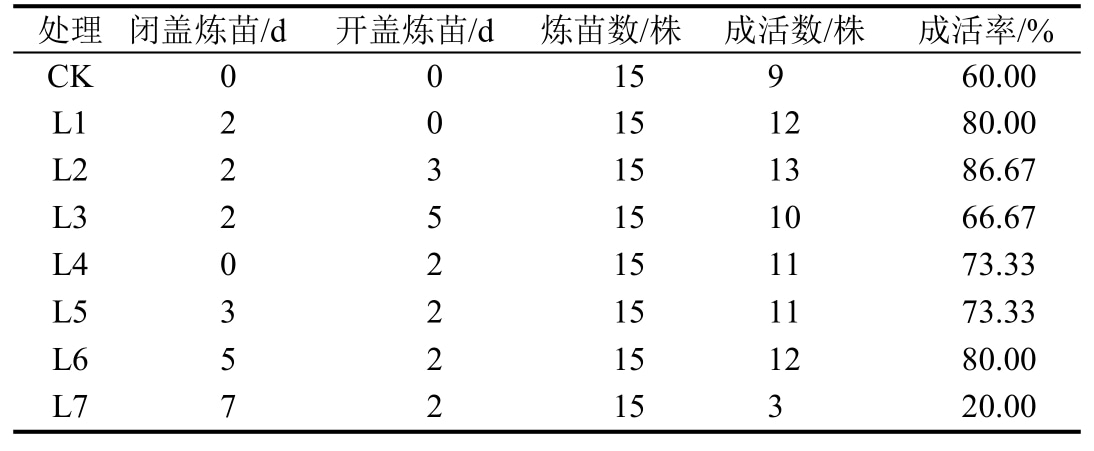 表5 不同煉苗時(shí)間對(duì)移栽成活率的影響