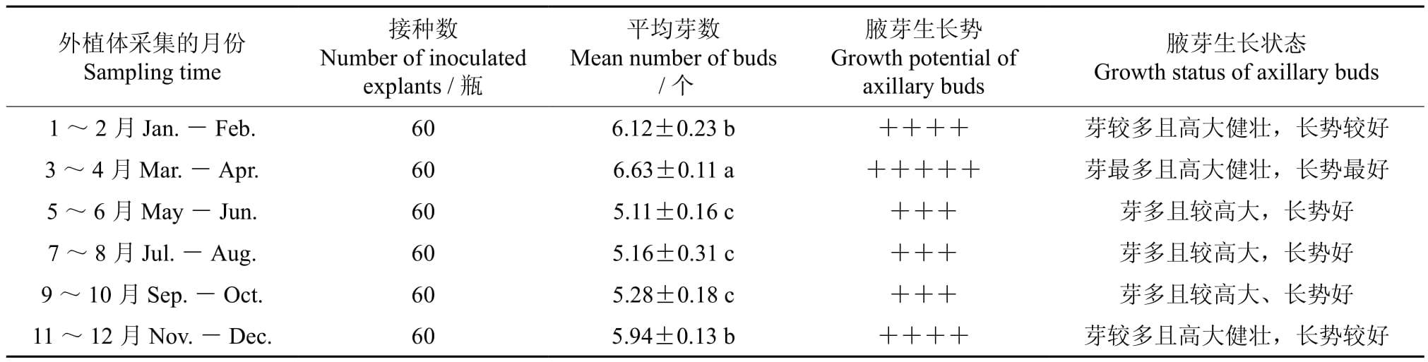 表1 外植體的不同采集時間對其腋芽萌發(fā)的影響?