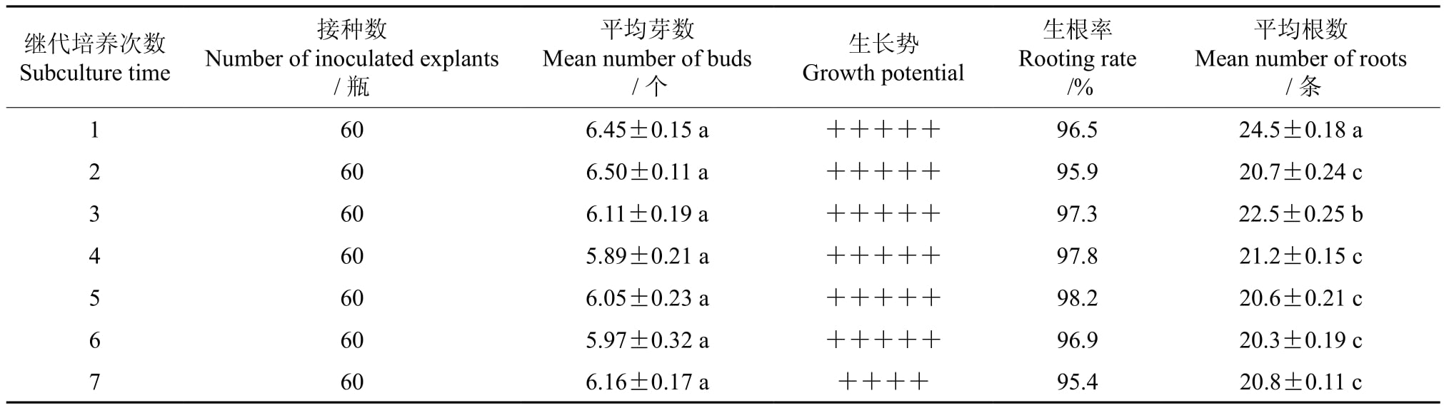 在連續(xù)進行的7次繼代培養(yǎng)中,繼代培養(yǎng)的不同次數(shù)對多花黃精增殖的影響沒有達到顯著差異水平,第1~7次繼代培養(yǎng)增殖的平均芽數(shù)分別為6.45、6.50、6.11、5.89、6.05、5.97和6.16 個,差值小于0.7(見表3)。觀察發(fā)現(xiàn),隨著繼代培養(yǎng)次數(shù)的增加其增殖的平均芽數(shù)雖然沒有顯著的差異,前6次繼代培養(yǎng)的芽體均健壯高大,葉片均鮮嫩;但是,繼代培養(yǎng)到第7次以后,增殖過程中有輕微的玻璃化現(xiàn)象出現(xiàn),繼續(xù)增加繼代培養(yǎng)的次數(shù)后,玻璃化現(xiàn)象愈發(fā)嚴(yán)重。因此,綜合考慮多花黃精工廠化育苗系統(tǒng)認(rèn)為,在不嚴(yán)重危害苗木生產(chǎn)又能保證苗木數(shù)量的前提下,適宜的繼代培養(yǎng)次數(shù)應(yīng)為7次。