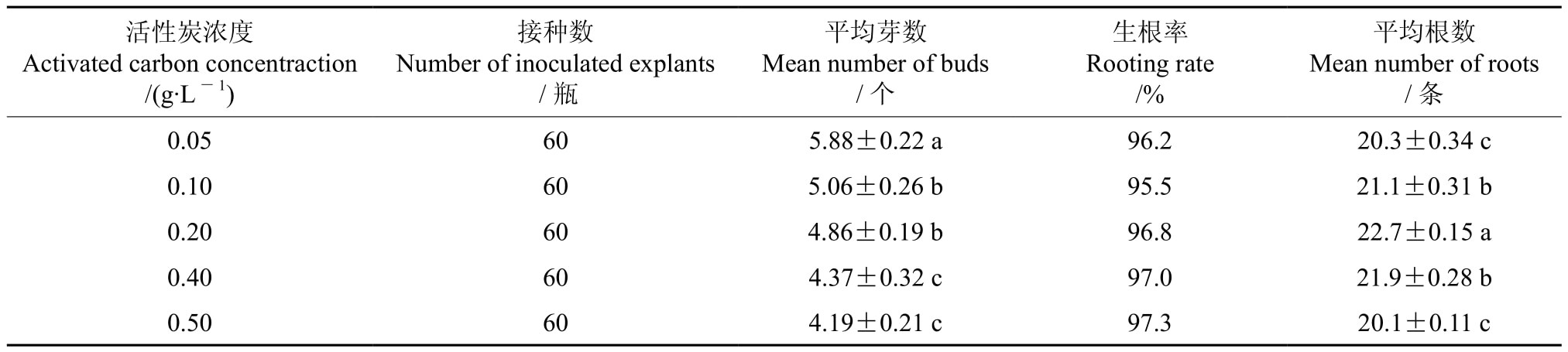 表4 含有不同濃度活性炭的培養(yǎng)基對多花黃精組培苗增殖和生根的影響