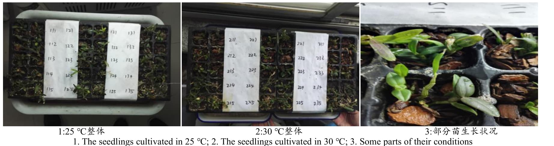 經(jīng)預(yù)實(shí)驗(yàn)發(fā)現(xiàn)一次性澆透水過后,3天之后基質(zhì)干透,需再次澆水,為防止水分過多爛根,水分較少根部枯萎,澆水周期定為3天。每隔十天觀察記錄一次現(xiàn)象,大約3個(gè)月之后,對(duì)數(shù)據(jù)進(jìn)行生物統(tǒng)計(jì)學(xué)統(tǒng)計(jì),統(tǒng)計(jì)出組培苗的成活率和幼苗的生長(zhǎng)速率,可得出適宜石斛煉苗的條件和對(duì)其影響大的外界因素,從而實(shí)現(xiàn)對(duì)鐵皮石斛進(jìn)行的生產(chǎn)培育工作。通過對(duì)鐵皮石斛的溫度、培養(yǎng)基質(zhì)、水源等影響因素進(jìn)行分組處理(表3、4),經(jīng)一年的觀察,以及對(duì)出芽時(shí)間和數(shù)量的記錄,得出了鐵皮石斛煉苗快恢復(fù)(以分化出第一芽的時(shí)間為依據(jù))的培養(yǎng)條件為30℃,⑤號(hào)培養(yǎng)基質(zhì)并用光照過的自來水澆灌,第一芽分化的時(shí)間只有10 d。但這種條件對(duì)于鐵皮石斛日后生長(zhǎng)不利,極易會(huì)出現(xiàn)枯死、爛根等情況。后期有利于鐵皮石斛生長(zhǎng)(以植株長(zhǎng)勢(shì)及后出芽總數(shù)為依據(jù))的培養(yǎng)條件是25℃,③號(hào)培養(yǎng)基質(zhì)。水質(zhì)方面,自來水與光照過的自來水效果差不多,但均優(yōu)于去離子水。在此條件下幼苗全部存活并且長(zhǎng)勢(shì)良好,澆水次數(shù)方便人工管理,適合大面積煉苗(圖3)。
