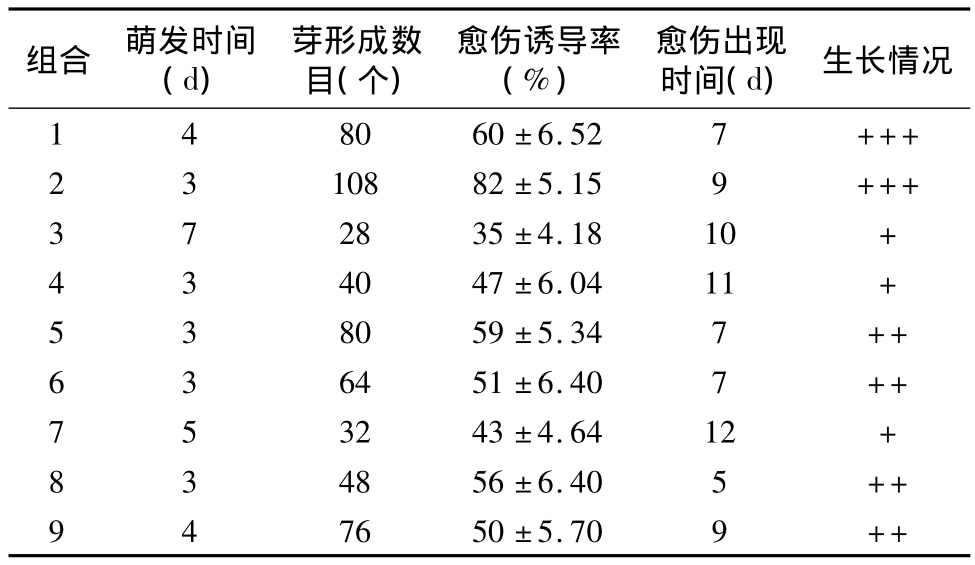 表2 不同濃度激素配比對(duì)芽形成及愈傷組織誘導(dǎo)的影響