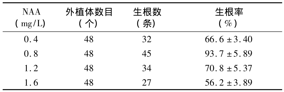 表3 不同濃度NAA對(duì)不定芽生根率及生根數(shù)目的影響