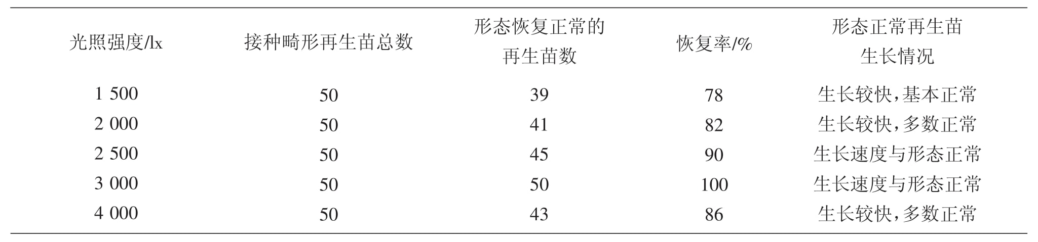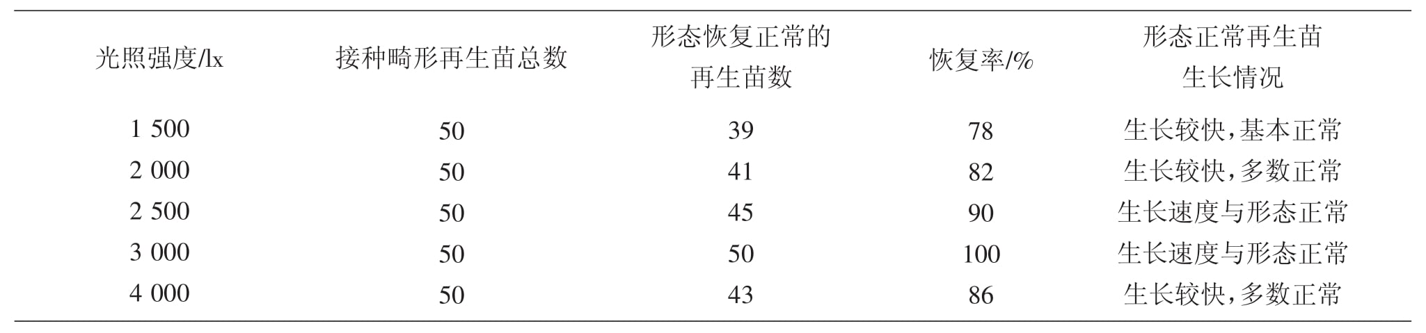 從表2可以看出,冰燈玉露形態(tài)正常率較高,原因主要是由于試驗(yàn)采用的培養(yǎng)基為MS附加0.25 mg·L-1的BA,因此,組培苗形態(tài)普遍變得較為正常;但在不同溫度下,形態(tài)正常苗的比例有所不同,當(dāng)溫度為20℃時(shí),獲得的形態(tài)正常的組培苗數(shù)多,而隨著溫度的增加,組培苗恢復(fù)率也逐漸下降,到28℃時(shí),僅有38%。說明冰燈玉露形態(tài)建成培養(yǎng)的溫度應(yīng)采用較低的溫度。在試驗(yàn)中,也曾采用18℃進(jìn)行培養(yǎng),但結(jié)果顯示,幾乎所有組培苗都停止生長,只有個(gè)別生長正常,說明過低溫度也不利于冰燈玉露組培苗的形態(tài)建成。雖然在20℃時(shí)可以獲得較高的冰燈玉露組培苗的恢復(fù)率,但也因溫度較低,組培苗生長速度較慢,也不是理想的培養(yǎng)條件。為此,試驗(yàn)又采用不同光照強(qiáng)度來提高形態(tài)重建率,希望獲得較高、較快的冰燈玉露形態(tài)重建培養(yǎng)。