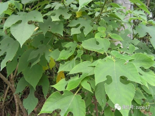 葉螺旋狀排列,廣卵形至長橢圓狀卵形,長6-18cm,寬5-9cm,先端漸尖,基部心形,兩側(cè)常不相等,邊緣具粗鋸齒,不分裂或3-5裂,小樹之葉常有明顯分裂,表面粗糙,疏生糙毛,背面密被絨毛,基生葉脈三出,側(cè)脈6-7對;葉柄長2.5-8cm,密被糙毛;托葉大,卵形,狹漸尖,長1.5-2cm,寬0.8-1cm。
