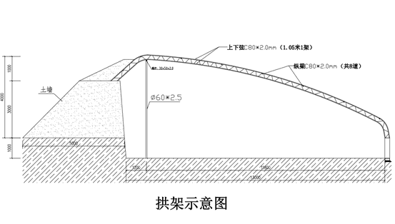 這種結(jié)構(gòu)的大棚,各地區(qū)不盡相同,但其主要參數(shù)和棚形基本一致,大同小異。大棚的跨度6-12米、長度30—60米、肩高1一1.5米、 脊高1. 8—2.5米;按棚寬(跨度)方向每2米設(shè)一立柱,立柱粗6—8厘米,頂端形成拱形,地下埋深50厘米,墊磚或綁橫木,夯實(shí),將竹片(竿)固定在立柱頂端成拱形,兩端加橫木埋入地下并夯實(shí);拱架間距1米,并用縱拉桿連接,形成整體;拱架上覆蓋薄膜,拉緊后膜的端頭埋在四周的土里拱架間用壓膜線或8號(hào)鉛絲、竹竿等壓緊薄膜。