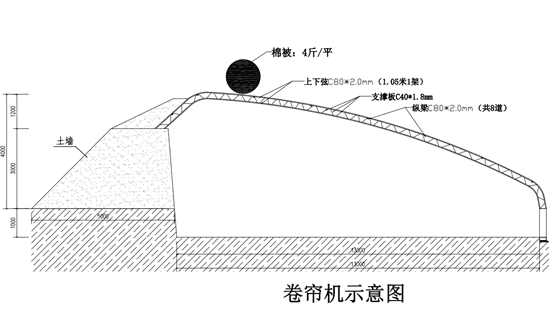 這種大棚跨度4一12米,肩高l一1.8米,脊高2.5—3.2 米,長度20—60米,拱架間距0.5—1米,縱向用縱拉桿(管)連接固定成整體??捎镁砟C(jī)卷膜通風(fēng)、保溫幕保溫、 遮陽幕遮陽和降溫。