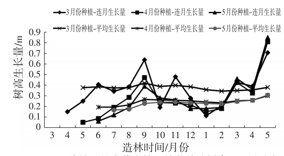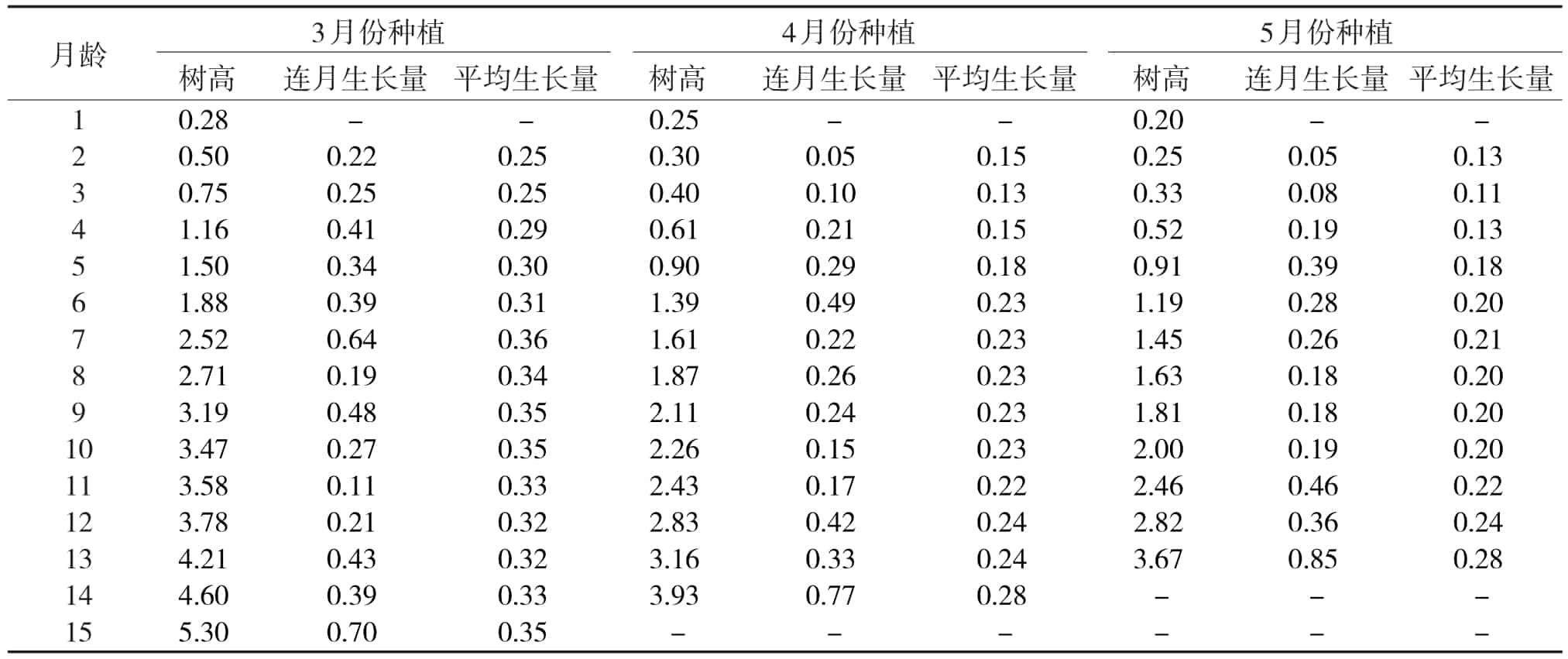 由表3可知:在相同的生長周期即同為12個(gè)月齡時(shí),3、4、5月份種植的大花序桉組培苗幼林林分平均樹高分別為3.78、2.83、2.82 m,且在這個(gè)周期內(nèi)的樹高月平均生長量分別為0.32、0.24、0.24 m。3月份種植的林分樹高生長量大于4、5月份種植的林分,且隨著林齡增長,林分樹高生長優(yōu)勢(shì)一直保持。3、4、5月份種植的大花序桉組培苗林分樹高連月生長量趨勢(shì)基本一致,造林當(dāng)年8月施肥后,在9月時(shí)樹高連月生長量均達(dá)大,分別為0.64、0.49、0.39 m。3月份種植的大花序桉組培苗林分在造林當(dāng)年10月遭受臺(tái)風(fēng)影響后樹高連月生長曲線出現(xiàn)較大波動(dòng),而4月份和5月份種植的大花序桉組培苗林分受臺(tái)風(fēng)影響不大。3、4、5月份種植的大花序桉組培苗幼林在第2年4月施肥后,均表現(xiàn)出較強(qiáng)的高生長趨勢(shì)。