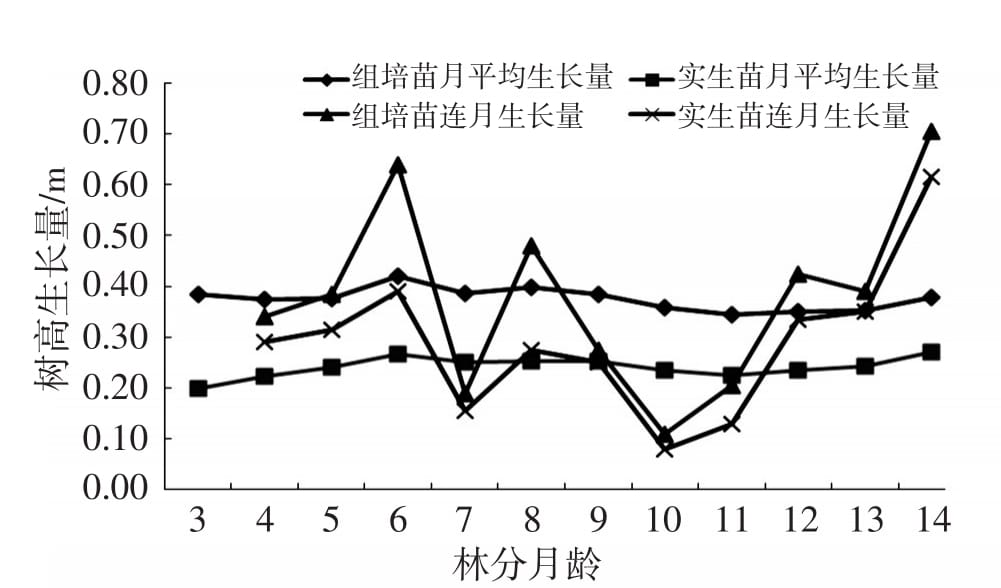 2.2 大花序桉組培苗和實(shí)生苗林分的樹高連續(xù)生長比較分析