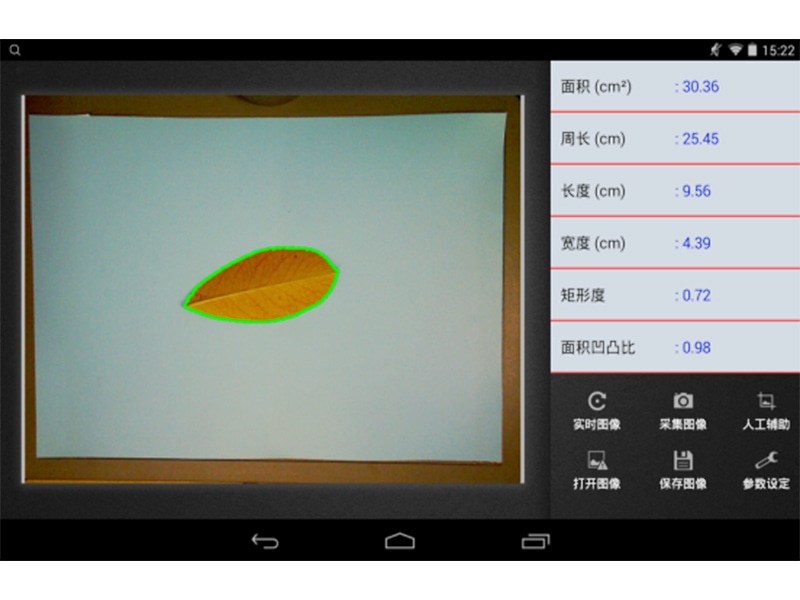 智能葉面積測量系統(tǒng)由圖像采集儀和裝入自主開發(fā)軟件的平板組成,采用本公司多年積累的面積測量算法,根據(jù)葉片輪廓特征提取、圖形實物轉(zhuǎn)換、邊緣檢測等技術(shù),能夠形象并快速得到所測葉片面積、周長、蟲洞數(shù)量等參數(shù)。相比傳統(tǒng)的葉面積,具有測量更快速簡便、結(jié)果更形象客觀、數(shù)據(jù)多樣并大大減少了人為操作帶來的誤差。