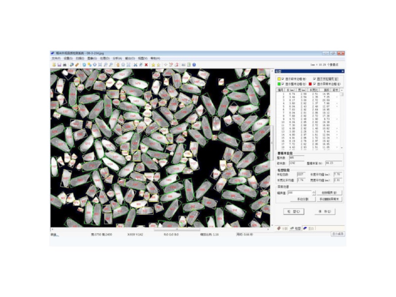 1.軟件可自動計算出粒型的指標(biāo),主要包括每個米粒的長、寬、長寬 比、面積和碎米標(biāo)記;米??倲?shù),米粒長、寬和長寬比的平均值;米粒的整米數(shù)、碎米數(shù)、整精米率;